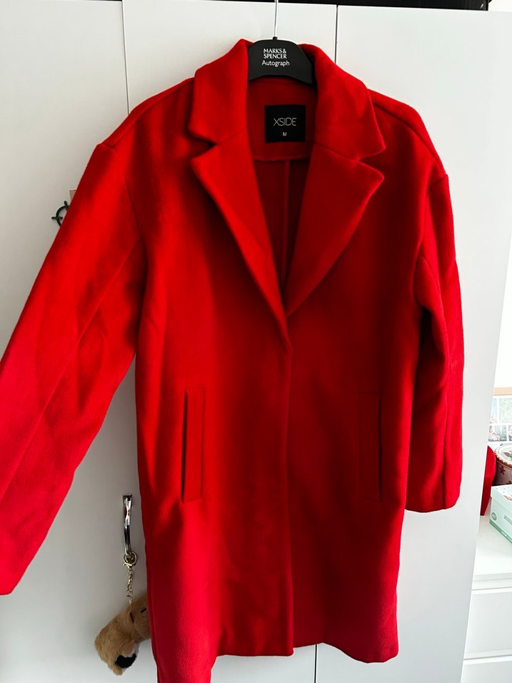 Kırmızı, yün görünümlü kumaştan, klasik yakalı ve ön cepli sıcak tutan kaban. İki koltukaltı arası 53 cm omuzdan aşağıya 84 cm. Sorunu yok astarsızdır