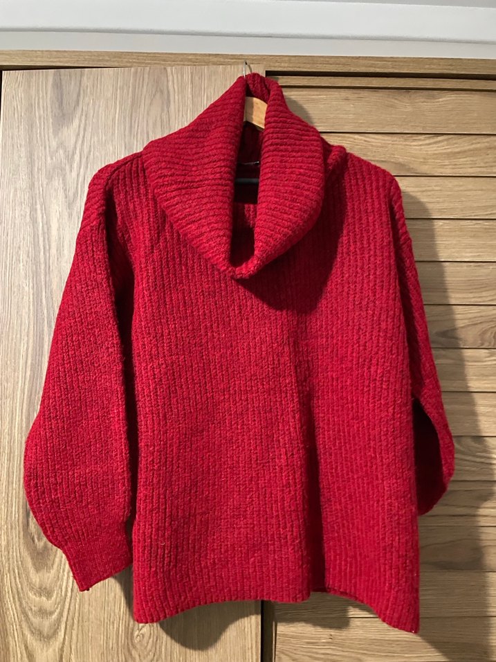 Kırmızı parlak renkte, yün örme kadın kazak. Yüksek yakalı, uzun kollu ve bol kesim, gündelik kullanıma uygun rahat bir model.