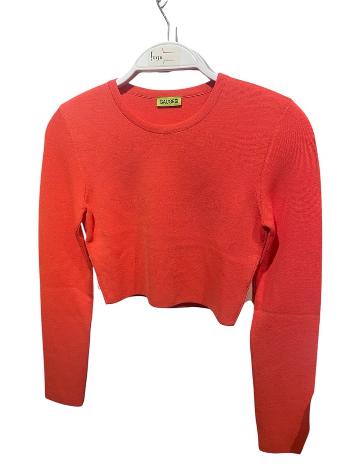 Turuncu,yuvarlak yakalı ve uzun kollu, yumuşak ve sıcak dokuma kumaştan yapılmış, kısa kesim ve sade renkli, sokak stili için uygun kadın triko kazak.