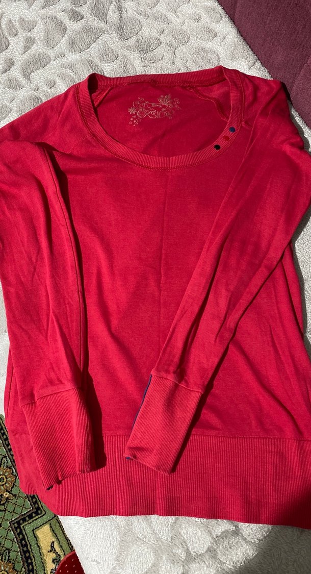 Düğmeli, uzun kollu, bisiklet yaka tişört.Yumuşak ve sıcak kumaştan, parlak kırmızı renkte, günlük kullanıma uygun.