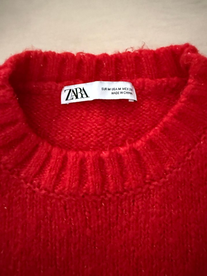 Zara markalı, yün örgü kumaştan yapılmış, kırmızı ve dar kesimli kadın kazak. Yuvarlak yaka ve uzun kolludur, günlük kullanıma uygundur. Sayılı giyildi tertemizdir