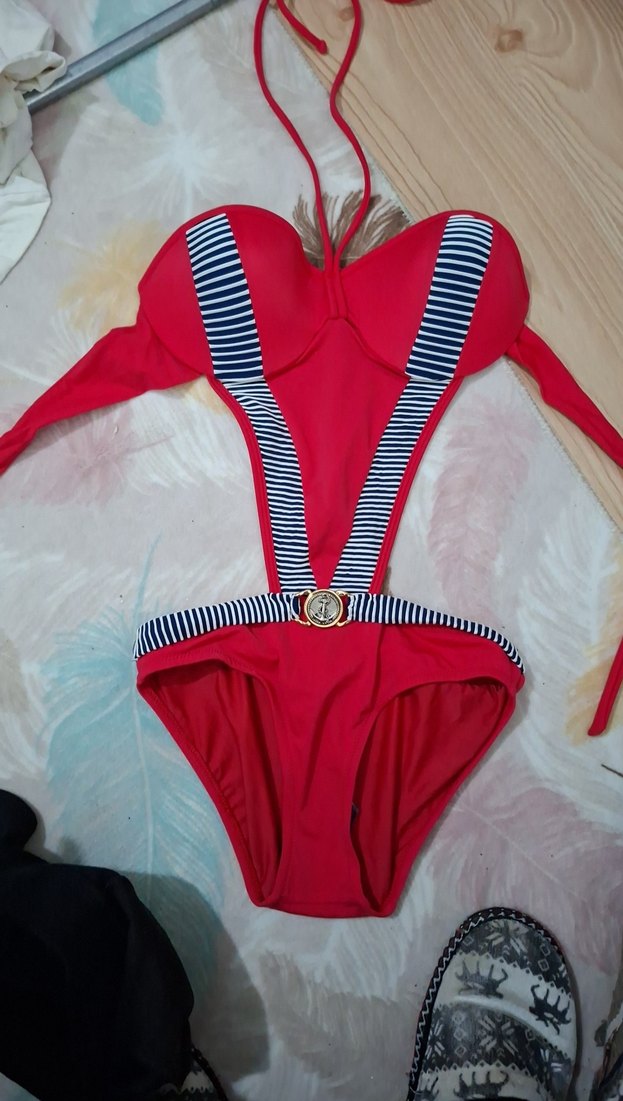 Kırmızı Zebra Desenli Askılı Mayo