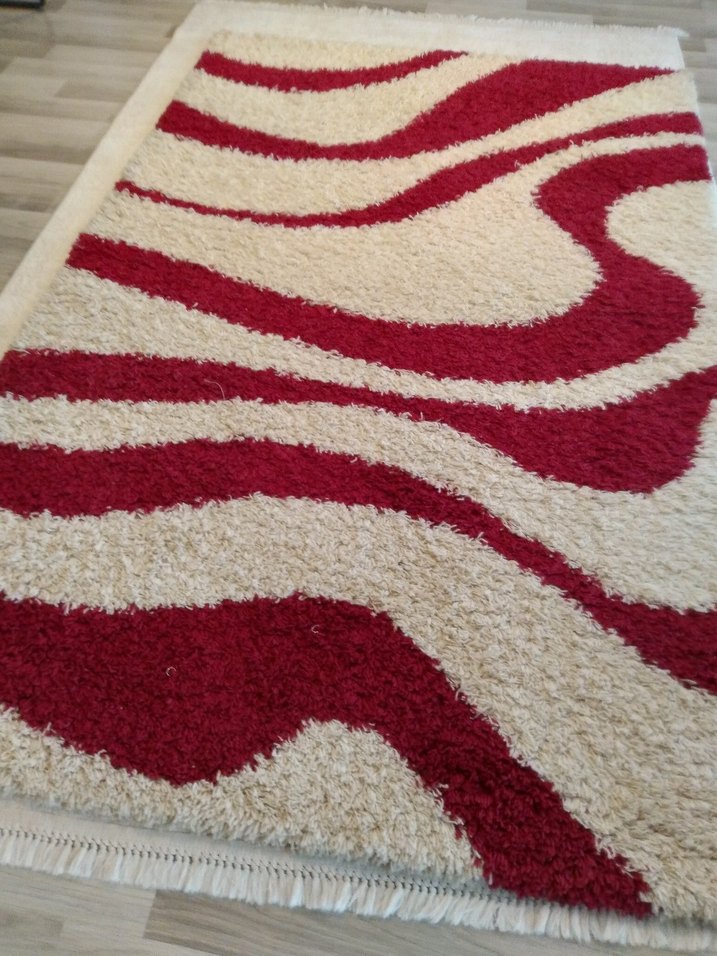 Canlı kırmızı zebra desenli çağdaş halı, krem zemin üzerinde şık bir dokunuş sağlar.