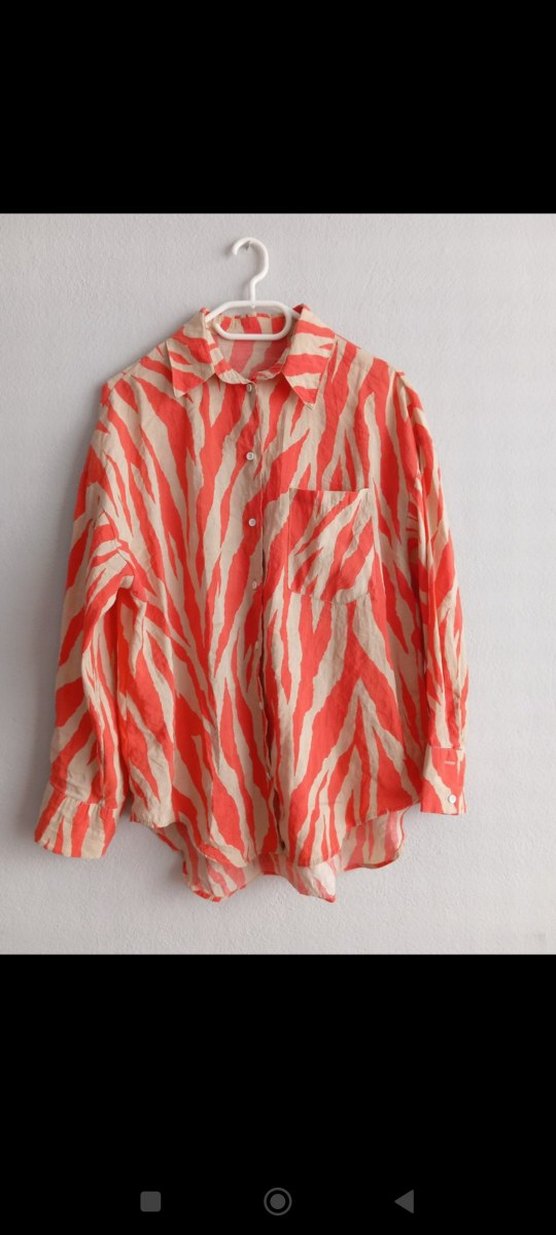 Rahat kesim, uzun kollu, düğmeli ve yakalı gömlek. Yumuşak keten kumaş üzerinde kırmızı zebra desenlidir.