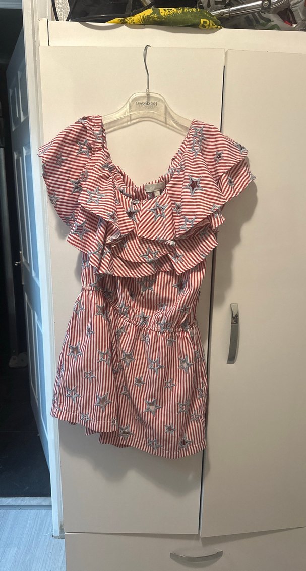 Kırmızı yıldız desenli, volanlı ve askısız yaka detaylı kol giyim yeri var straplez değildir şort astarlı