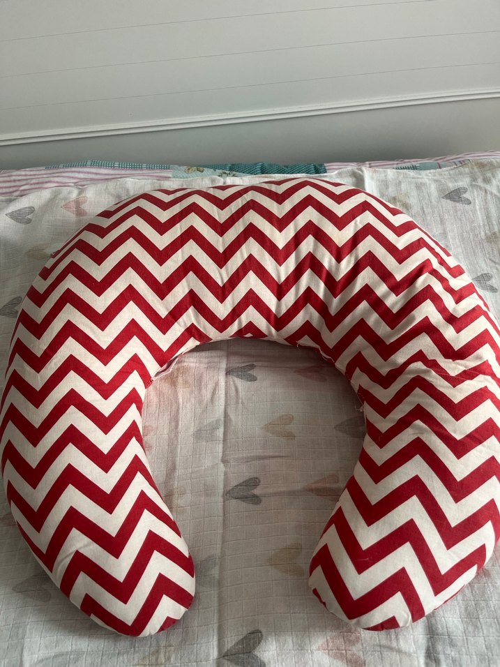Hamilelik ve emzirme sırasında rahatlık ve destek sağlayan kırmızı zigzag desenli yastık.