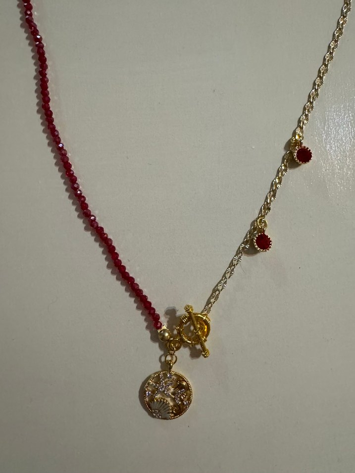 Kırmızı boncuklu ve altın renk zincir detaylı, zarif kolye. Bohem tarzda, romantik akşamlar ve günlük için uygun midi uzunlukta minimal tasarım.