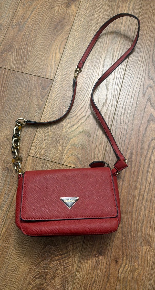 Kırmızı deri kadın çanta, zincir detaylı acinca derisindeki yipranmayi gorsel olarak ekledim. Orijinal derimod canta