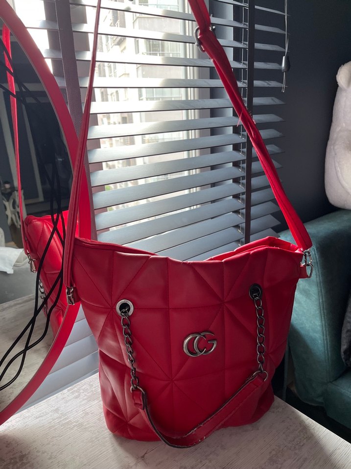 Parlak kırmızı deri kadın çanta, zincir detaylı ve desensiz, trendi günlük sokak stili için uygun büyük