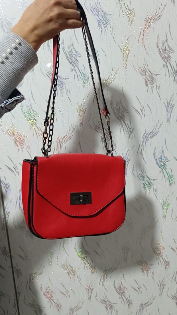 Kırmızı renkli, zincir detaylı deri kadın çantası, desenli ve günlük sokak stiline uygun.