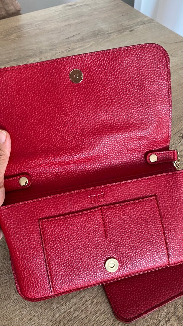 Parlak kırmızı deri kadın portföy çanta, işleme detaylı ve zincir askılıdır. Parisli klasik zarafeti modern klasik tarzla buluşturur, günlük kullanıma uygundur. ✨