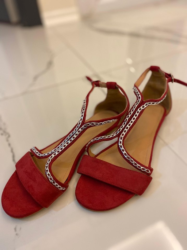 Kırmızı süet dolgu topuklu kadın sandalet, parlak zincir detayları ve nakışlı desenlere sahip, romantik buluşmalar için ideal. Bohem tarzda.