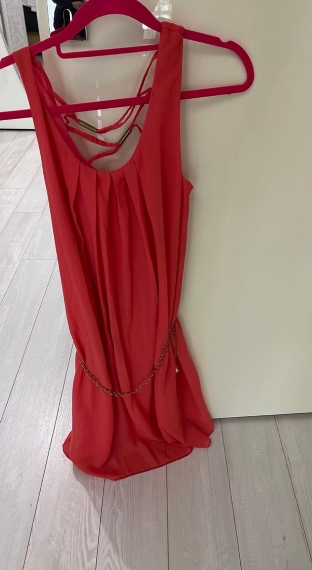 Kolsuz, kırmızı, zincir detaylı elbise. Tertemizdir. Hiç giyilmedi. M bedendir.