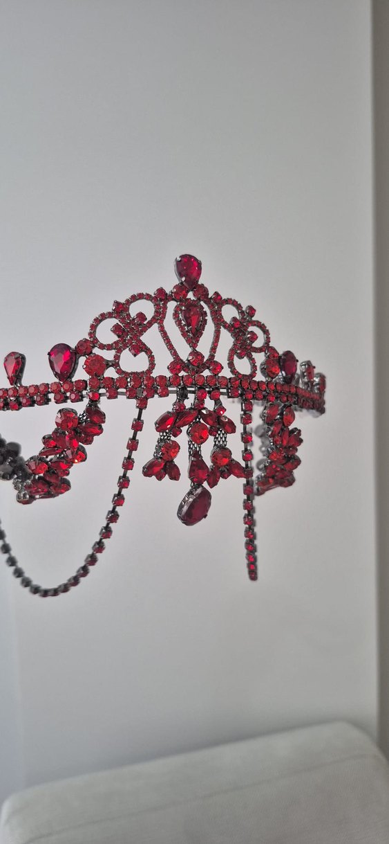 Koyu kırmızı renkte, cam detaylı ve zincir süslemeli gotik taç, avant-garde tarzı sevenler için uygun.