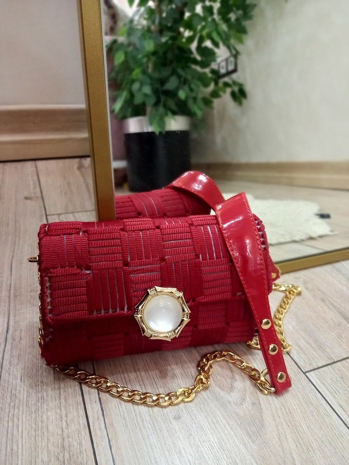 Kırmızı Zincir Detaylı İşlemeli Deri Kadın Çanta