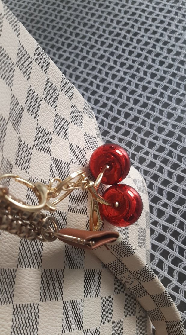 Kadın anahtarlık, zincir detayları ve iki canlı kırmızı aksesuarla, modaya uygun sokak stili için ideal.