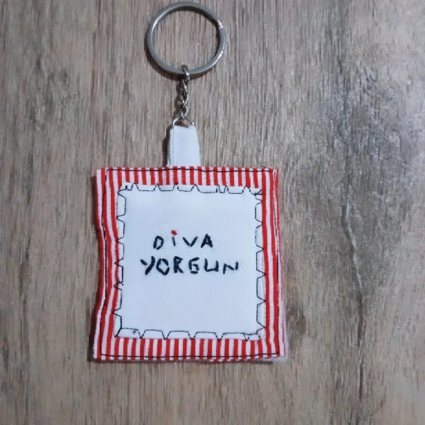 Kırmızı ve beyaz kumaştan, zincir detaylı kadın anahtarlık. Vintage ve bohem tarzda, üzerinde 'DiVA YORGUN' nakışı bulunur.
