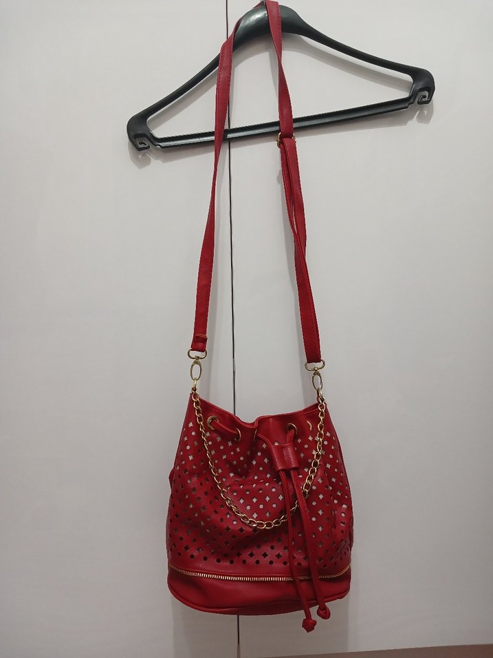 Kırmızı nakış desenli ve zincir detaylı kadın çantasıdır. Trendy ve günlük kullanıma uygundur.