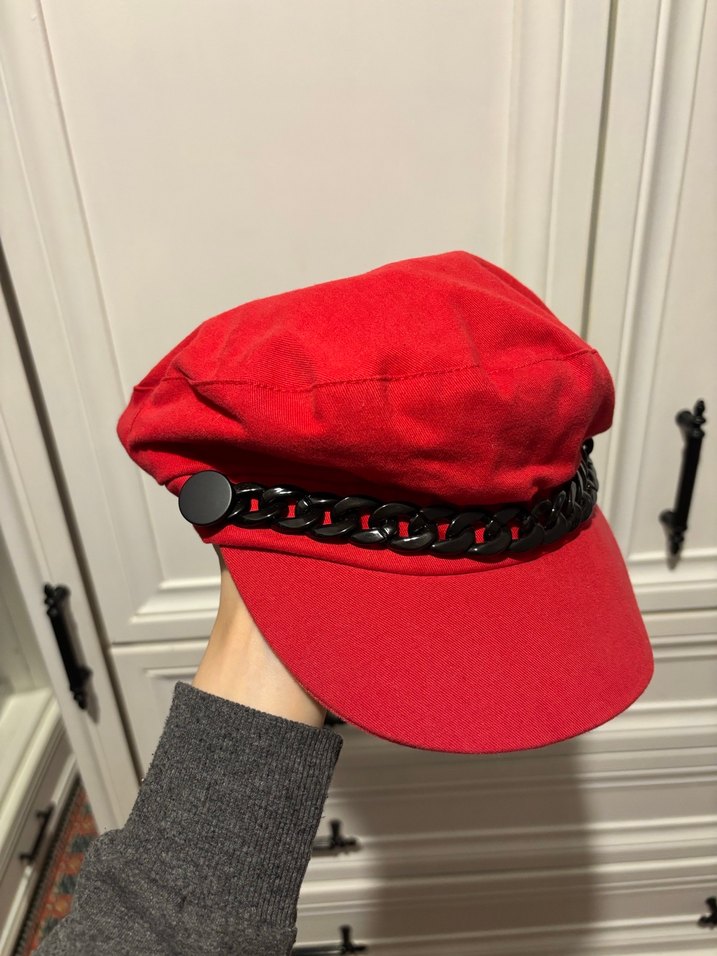 Sentetik kumaştan yapılmış, düğmeli zincir detaylı kırmızı kadın şapka. Paris tarzı ve punk rock havası yansıtıyor.
