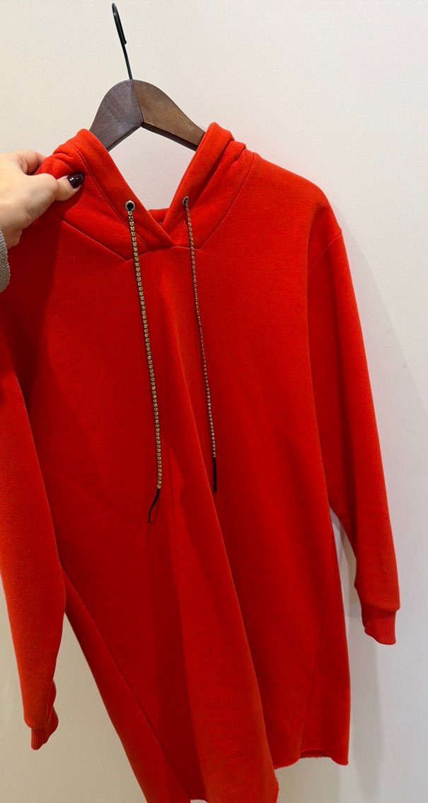 Kırmızı renkli, zincir detaylı, uzun kollu, normal midi boyda, rahat kesim kadın sweatshirt. Yumuşak ve sıcak kumaştan üretilmiştir.