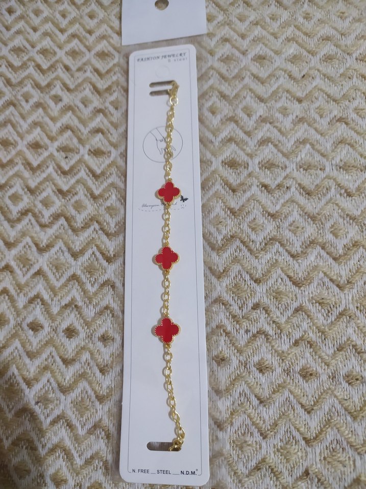 Altın renk zincir ve kırmızı baskılı çiçek motifli, minimalist ve çağdaş kadın bilekliği. Günlük kullanıma uygun. FREL_STEEL-NDM kodlu.