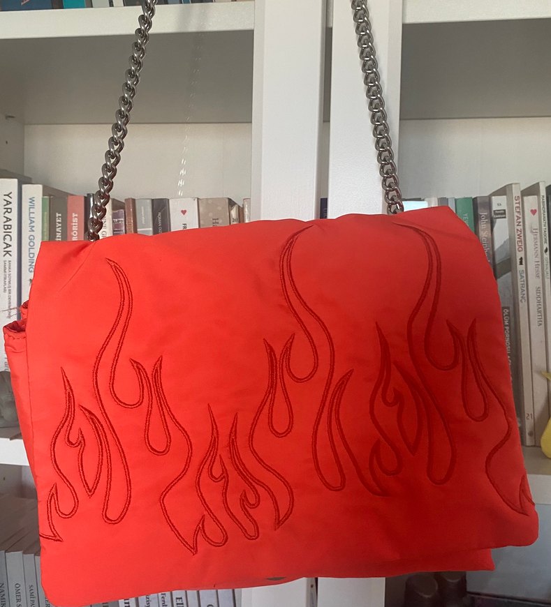 Kırmızı, parlak sentetik kumaştan, nakışlı alev desenli ve zincir detaylı kadın çantasıdır.