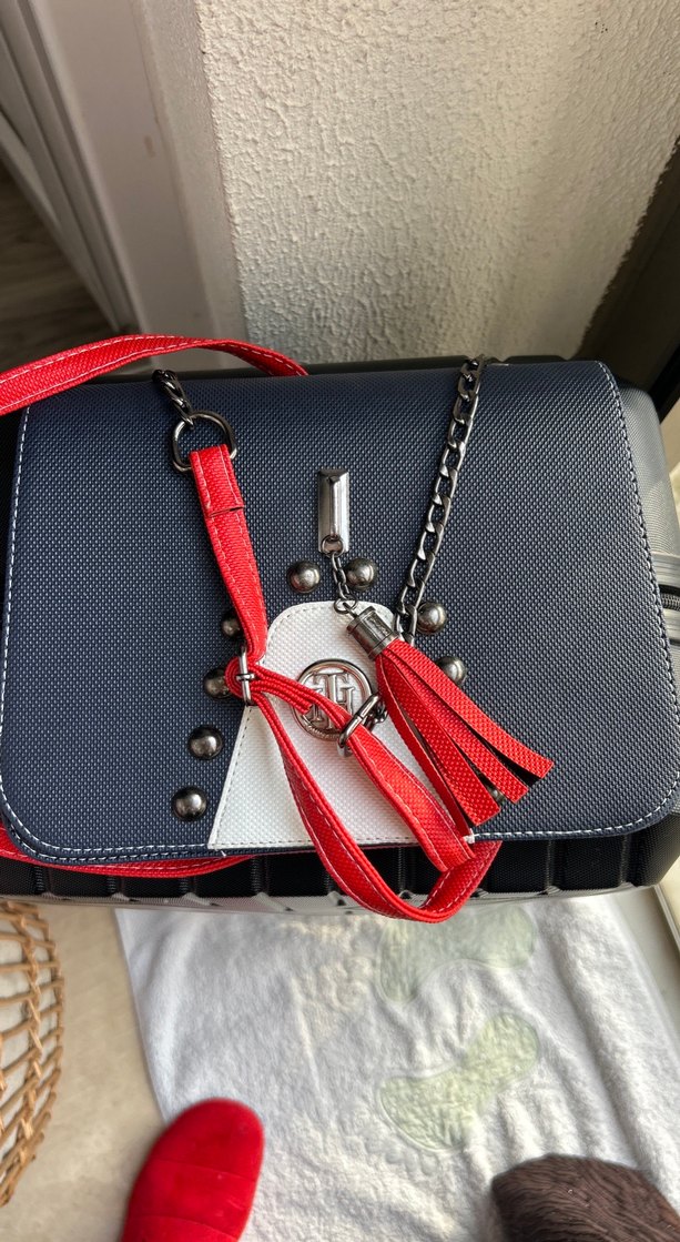 Sıfır kırmızı ve beyaz baskılı deri kadın çanta, zincir detayları ve püsküllerle süslenmiş, trend sokak stili için uygun.