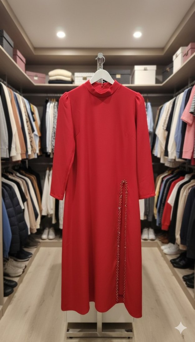 Kırmızı renkte, yüksek yakalı ve uzun kollu, zincir detaylı uzun ikili takım Nakış işlemeli ve sentetik kumaştan, günlük kullanıma uygun. 38 40 beden için uygundur ❤️