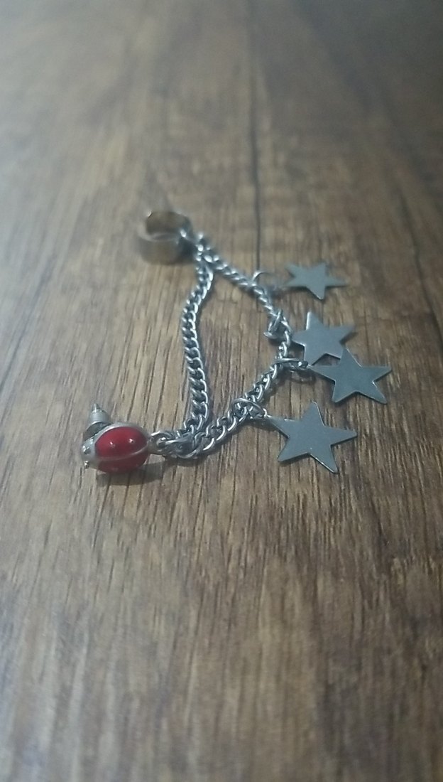 Bu kadın charm küpe , zincir üzerinde yıldız figürleri ve parlak kırmızı nakış detayı ile rock punk havası verir, romantik buluşmalar için uygun.