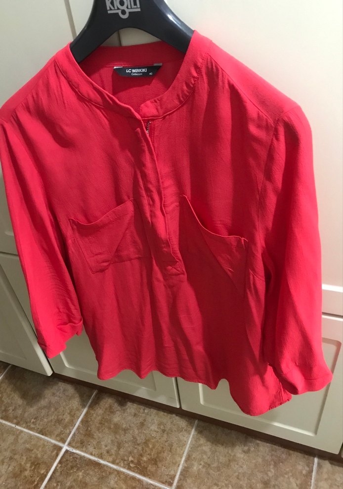 Kırmızı, düğmeli, uzun kollu, yuvarlak yakalı kadın gömlek. Rahat kesim ve ipeksi kumaş, gündelik kullanıma uygun midi boyda.