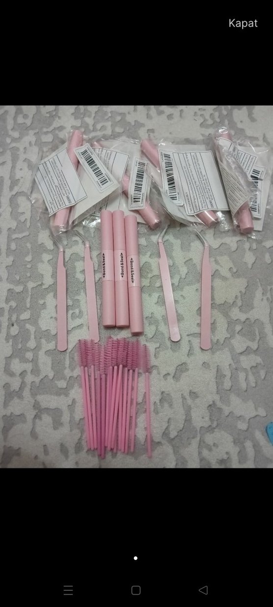 Pastel pembe renkte takma kirpik aplikatörleri, fırçalar ve cımbızlar içeren set, kirpik uygulamasını ve bakımını kolaylaştırır.