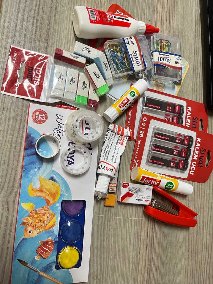 Yapıştırıcı, sulu boya, ataş, kalem ucu, bant ve kırmızı zımba gibi çeşitli kırtasiye ve hobi malzemelerini içerir. Toplam 500 tl