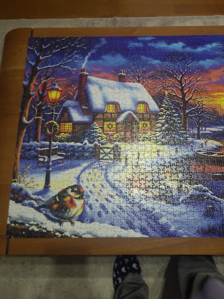 Bu puzzle, karla kaplı bir kulübe, aydınlatılmış sokak lambası ve ön planda bir kuş içeren renkli bir kış sahnesi sunar. Canlı renkler ve detaylar sıcak bir atmosfer yaratır. ❄️1500 parça eksiği yok çerçeveli 5000 tl çerçevesiz 3500 tl