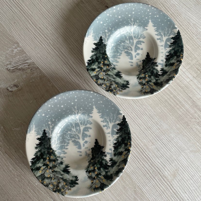 Gri ve beyaz renkte, kar ve ağaç desenli kış temalı tabaklar, mevsimlik yemekler için uygundur. ❄️