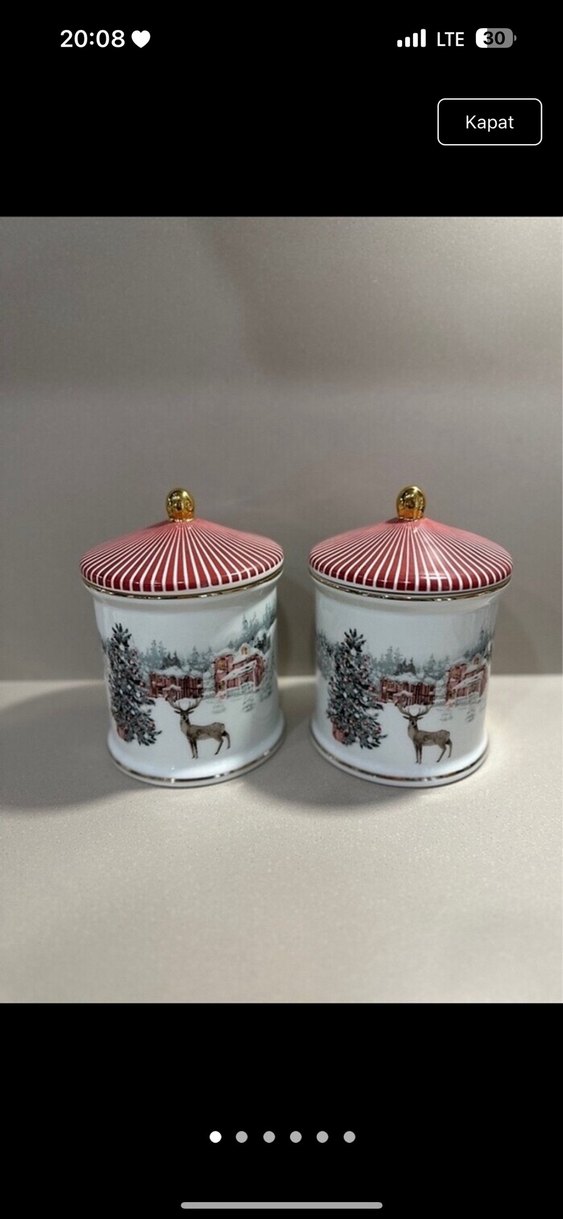 Kış manzarası ve geyik desenli, kırmızı beyaz çizgili kapaklı altın düğmeli beyaz saklama kabı seti.