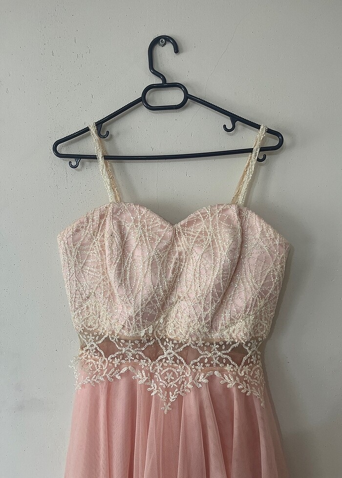 Kendi mezuniyetimde giymiştim sadece 1 kere . Bedenim small Üst kısmı işlemeli Harika bir elbise . Rengi pudra rengi toz pembe gibi