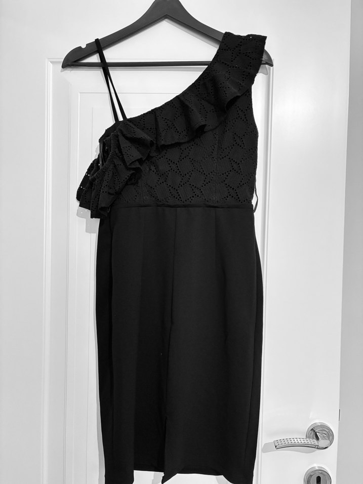 Siyah, işlemeli ve volanlı tek omuzlu, askılı detaylara sahip, diz boyu ve vücuda oturan abiye elbise Bir defa giyildi