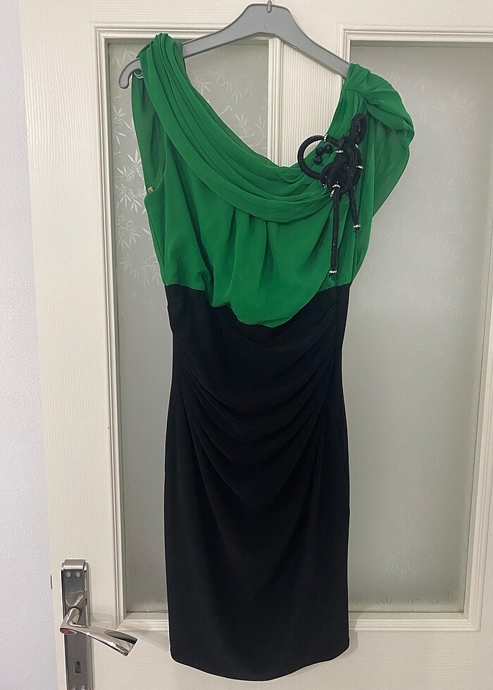 Bir kez giyildi üstü yeşil kendinden broşlu altı siyah kalem etek kısa abiye elbise