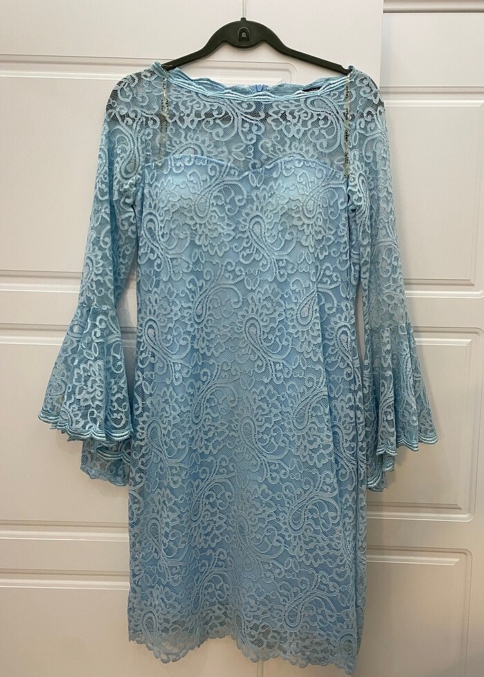Açık mavi dantelli kol detaylı sadece istemede bir kere giyildi hafif dizüstü çok şık elbise