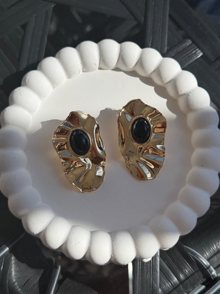 Koyu renkli soyut merkezli, fırfırlı tasarıma sahip kısa altın küpeler, modern klasik ve Paris tarzını günlük kullanıma sunar. ✨
