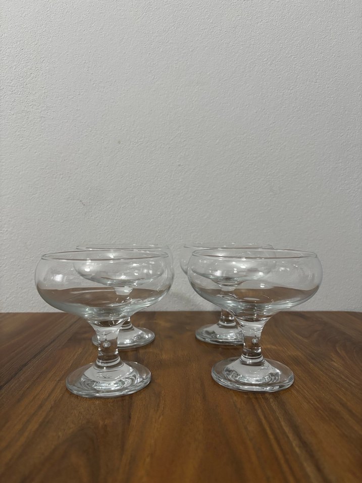 İçecek servisi için uygun, kısa ayaklı, yuvarlak kase şeklinde 4 adet şeffaf cam kase seti.