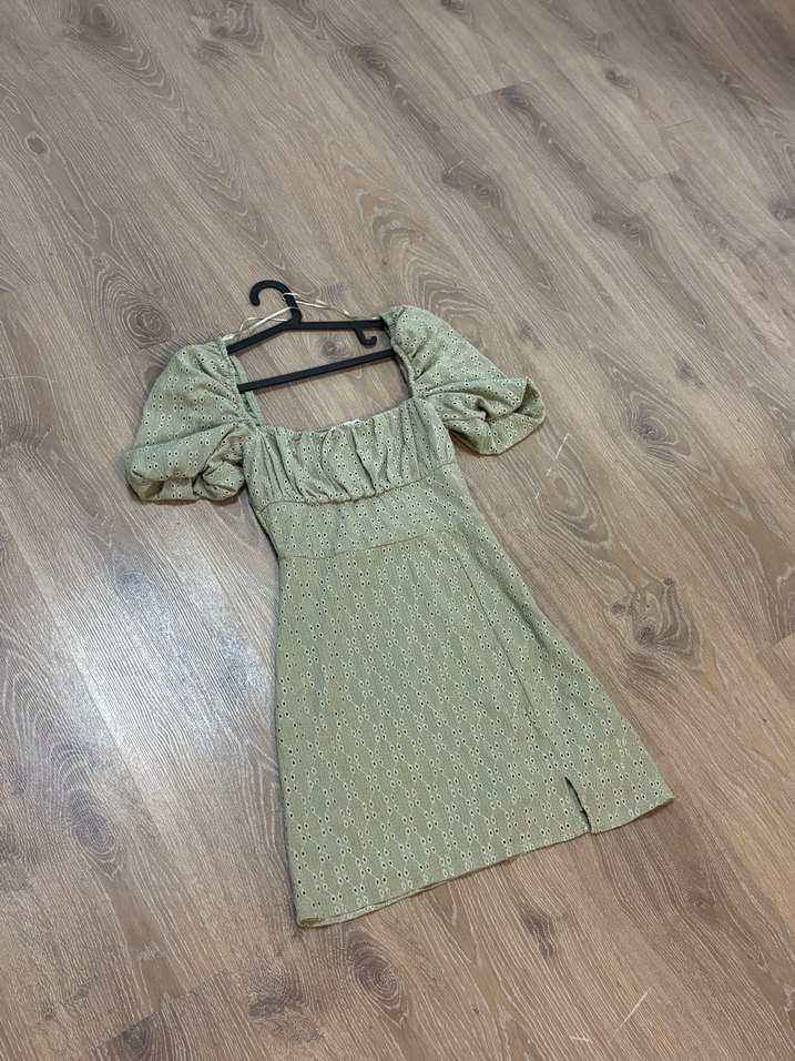 Kısa Balon Kol Kare Yaka Su Yeşili Mini Elbise