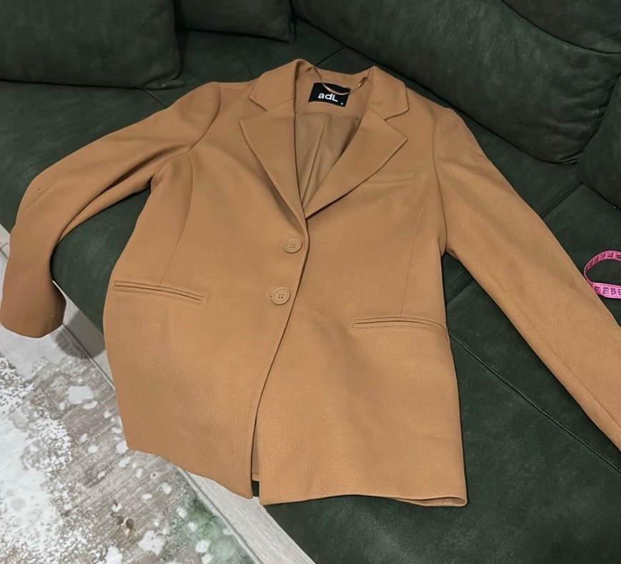 kısa kesim, düğmeli, uzun kollu ve yakalı kadın ceket. Ofis ve günlük kullanıma uygun, sade ve şık görünümlü.