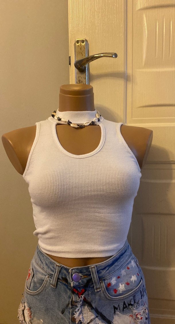 Yüksek yakalı, kolsuz ve beyaz kısa crop top, günlük sokak stili için uygun.