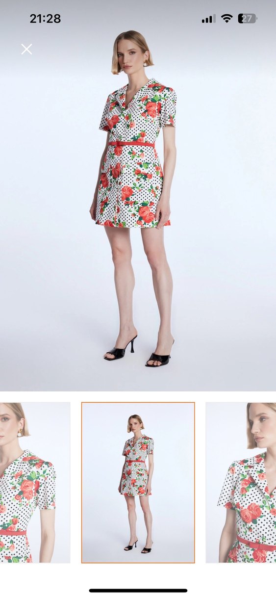 Kısa beyaz elbise, V yaka ve kısa kollu. Puantiyeli ve çiçek desenli, beli kemerli, rahat kesim ve yumuşak sentetik kumaştan, günlük kullanım için uygundur. Yeni etiketli hiç kullanılmadı AdL Mert Arslan tasarım. Belindeki kemerle gönderilecek