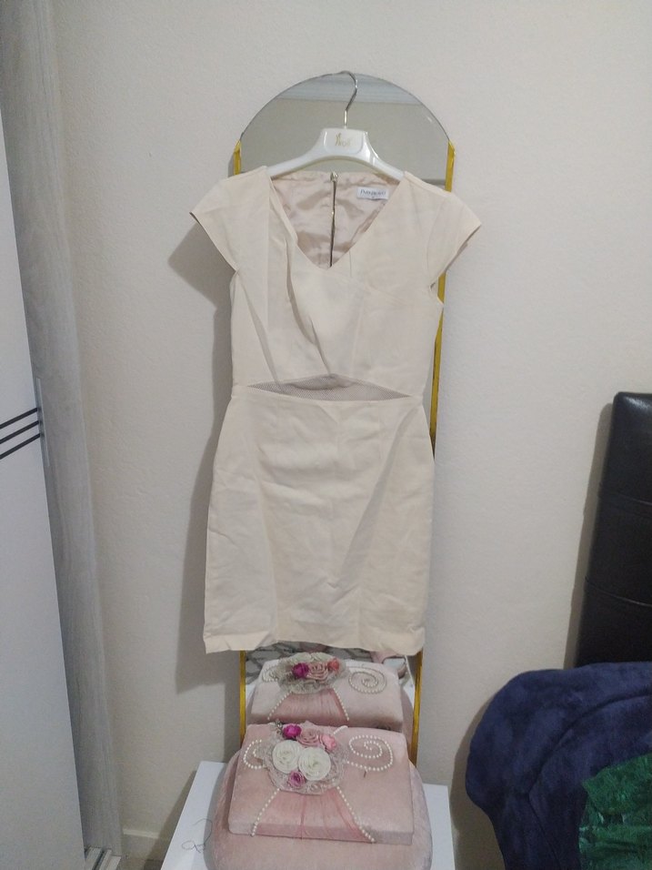 Kısa, beyaz renkli mini elbise, V yaka ve kolsuz tasarımıyla modern ve Paris esintili şık bir görünüme sahiptir.