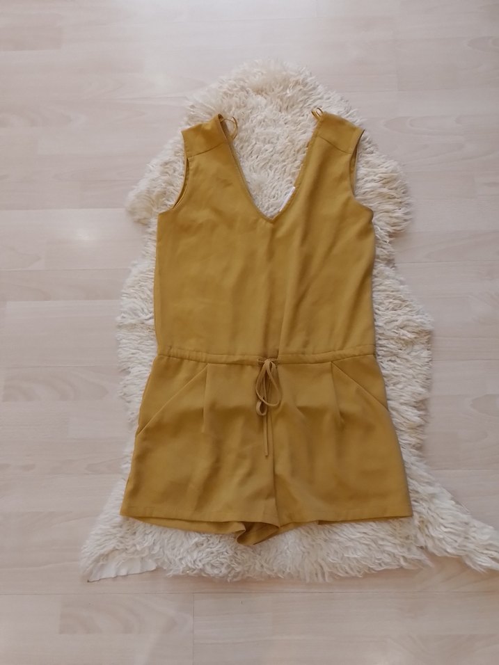 kumaştan, kolsuz ve V yaka kısa bol kesim tulum. Rahat ve bohem tarzıyla günlük kullanıma uygun. ✨