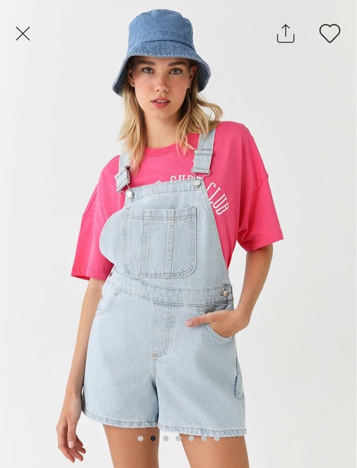 Bol kesim kısa denim tulumi. Günlük sokak stili için uygun.