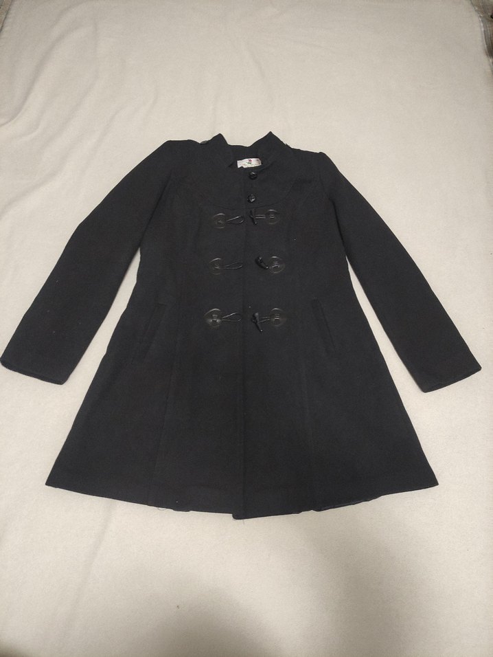 Uzun kollu, düğmeli siyah kaban, belden oturan ve hafifçe genişleyen etek ucu ile klasik bir görünüme sahiptir. 40 beden yazıyor ama kalıbı dar S-M uyumlu olduğunu düşünüyorum