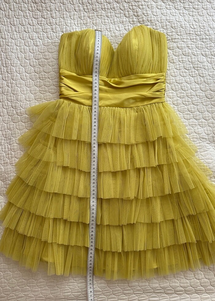 Çok tatlı kısa straplez elbise. Hiçbir sorunu yok 1 kere giydim. Bel 68, yukardan aşağı 72 cm, göğüs 80 cm. Boyum 1.55 kestirmedim, boyu daha uzun olan birinde daha güzel duracaktır.